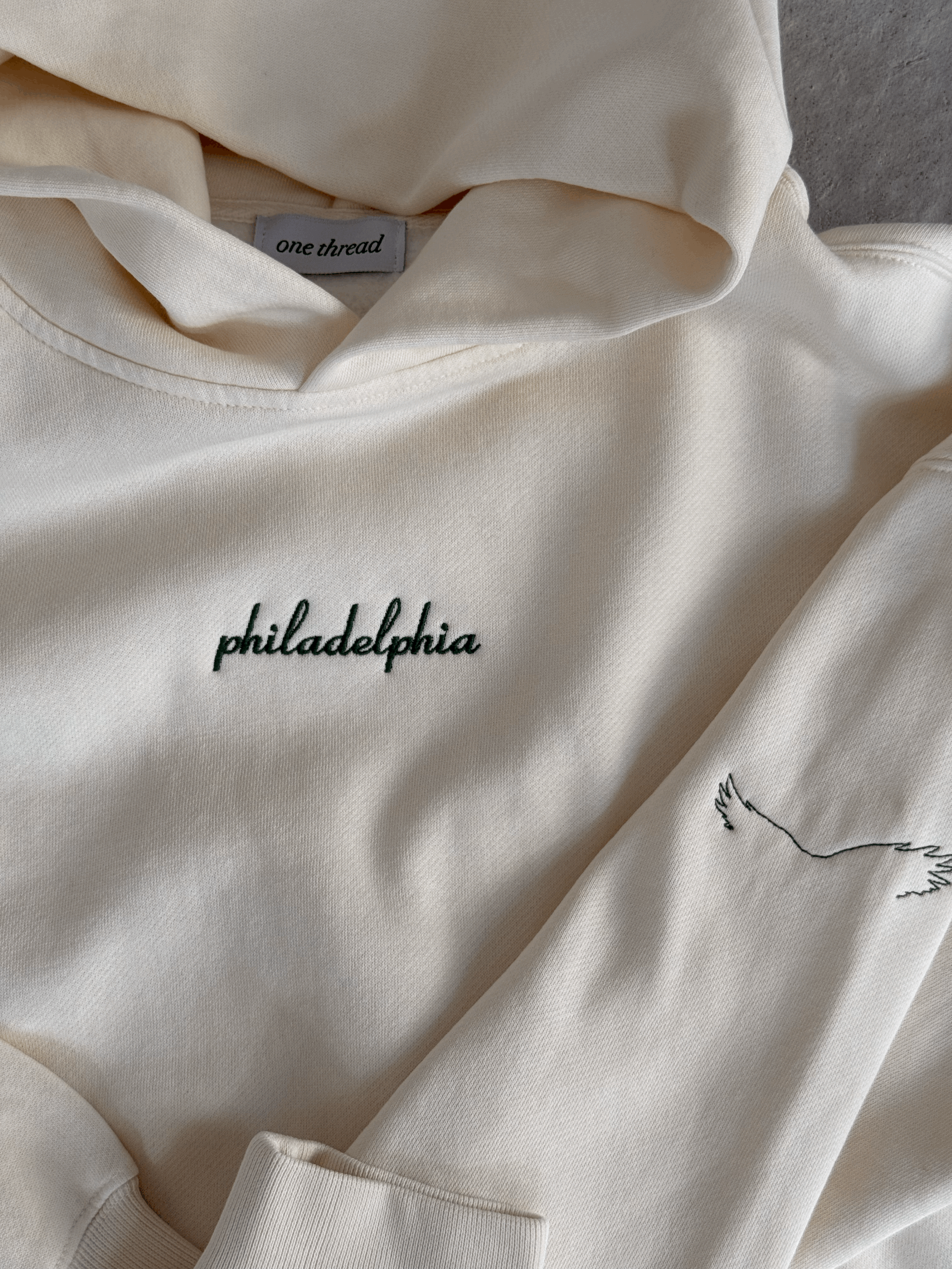 Categories: All tops totes & truckers tops Hometown Hoodie $90.00 Sold out Varsity ’33 Quarter-Zip $80.00 Kickback Crewneck $120.00 Sold out Phila Jersey $60.00 Philadelphia Fightins Crew $75.00 On The Road To Victory Crew $75.00 Sundays Are For The Birds Crew $75.00 1933 Bird's Rugby $60.00 Sold out The One Of A Kind Tee $40.00 One Thread Embroidered Tee $40.00 Baby Knit Custom Name Sweater $40.00 one thread gift card from $25.00
